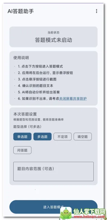 AI答题助手是安卓答题工具,基于OCR与大语言模型。能通过悬浮窗截图识别题目,调用模型快速出答案,适用于练习等场景。有屏幕截取、智能识别等功能,介绍了安装设置、支持题型及常见问题解决办法。