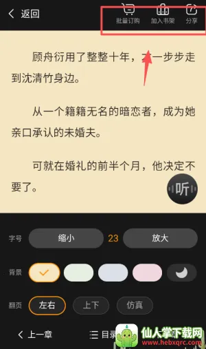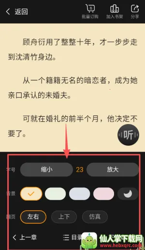 3、阅读时轻点屏幕中央可唤出菜单,在这里你能调整字体大小背景颜色,还能开启护眼模式保护视力。