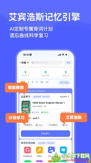 1. AI智能记忆曲线:基于间隔重复原理,自动计算遗忘概率,智能安排复习时间,强化记忆效果。