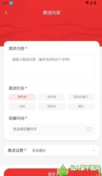 4.将项目跟进内容、跟进阶段、提醒时间进行输入设置后点击“保存”即可
