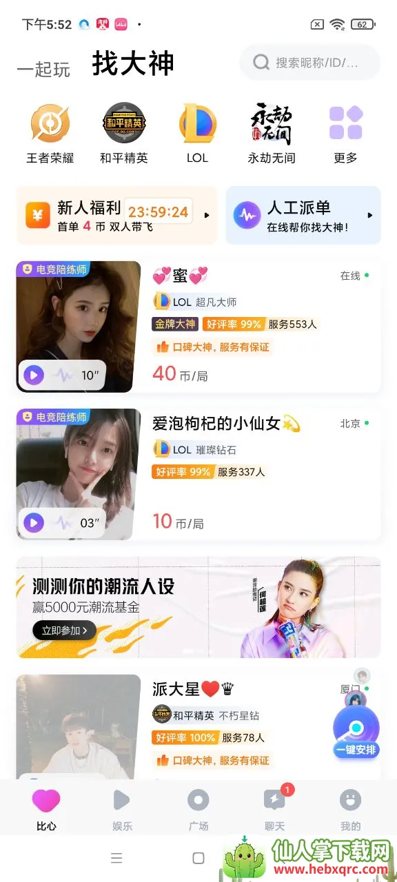 比心是一款超棒的游戏陪玩软件。它能帮你解决游戏时缺队友、技术提升难等问题。这里有800万电竞大神,覆盖英雄联盟、王者荣耀等各类主流游戏。无论你想找游戏搭子一起开黑,还是让高手带你上分,比心都能满足。它的优势明显,高手能指导技巧,陪玩师能陪你轻松搞笑玩游戏,缓解压力。而且不止游戏,还有情感陪伴服务。特色是主流热门新游戏陪练多,有明星战队入驻,官方指定平台更专业。使用方便,打开就能快速匹配或组队。服务明码标价,资金平台托管保障安全。还能发布动态、进多人语音房间拓展社交圈。总之,比心能让你在游戏中收获满满乐趣,不再孤单,轻松享受游戏时光。
