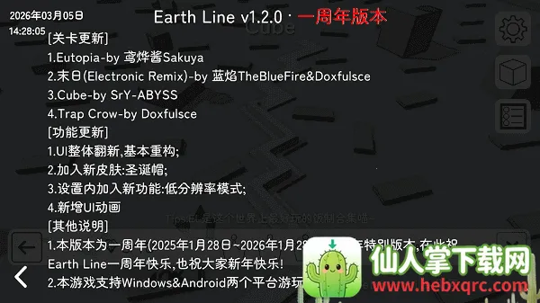 跳舞的线EarthLine饭制版作为玩家自制版本,相较原版新增大量高难度关卡,挑战性大幅提升。玩家需紧随音乐节奏变化,精准把控线条走向,在动感旋律中体验极致操作快感。核心玩法亮点音乐节奏驱动:所有障碍物的出现与移动严格契合背景音乐节拍,玩家需依靠听觉预判路线变化,实现听音辨路的沉浸式操作。路径选择机制:每条关卡提供多条行进路线,玩家可根据自身节奏感与操作习惯灵活选择,提升通关策略性。道具收集系统:在行进途中收集特殊道具,可用于解锁全新角色皮肤及隐藏音乐关卡,丰富游戏可玩性。单指极简操作:仅需单指点击屏幕即可控制线条转向,操作门槛低但技巧上限高,强调与音乐的同步精准度。全新原创曲目一览Eutopiaby鸢烨酱Sakuya末日ElectronicRemixby蓝焰TheBlueFireDoxfulsceCubebySrY-ABYSSTrapCrowbyDoxfulsce沉浸式关卡体验游戏通过精心设计的场景与原创音轨,带领玩家踏上一段多维度的视听冒险:欣赏冬去春来的四季流转,感受自然韵律与节奏的融合从高空俯冲而下,直面汹涌澎湃的海洋风暴穿越无垠沙漠,在荒芜中追寻生命的微光挑战噩梦般的崎岖悬崖与动态移动平台,考验反应与节奏把控体验由玩家创作的高质量原创音轨,每一首都与关卡完美契合多重关卡结构搭配多维难度梯度,讲述风格各异的视觉故事延续一指禅操作理念,上手简单却极具深度实现视觉艺术与听觉节奏的高度统一,打造感官协同的极致体验。