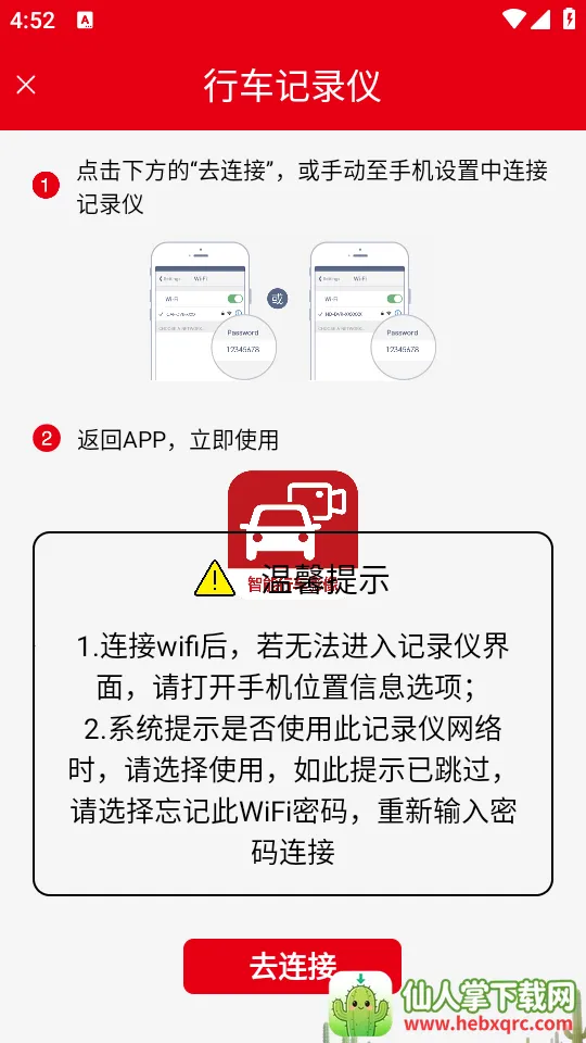 连接手机也不难,下载安装智能行车影像app,打开软件进入首页,点击记录仪,再点击下方去连接,或者手机直接进入WiFi连接页面连接记录仪,返回app就能使用啦。有了它,操作行车记录仪变得更便捷,能随时了解行车记录情况,为你的出行提供更多保障,真的很值得拥有!