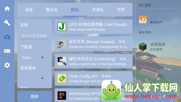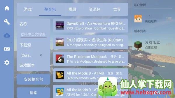 1、在启动器中点击整合包栏目可以看到详细的整合包资源;选择模组可以任意下载模组,这里支持中文英文搜索,可以按下载源,游戏版本,类型等等进行挑选