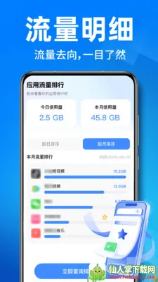 3. 流量管理清晰:实时统计应用流量消耗,支持按日按月排行,清晰掌握流量去向,避免超额扣费。