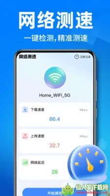 1. 网络测速精准:一键启动标准测速,能精准获取下载上传速度与网络延迟,直观展现网络性能。
