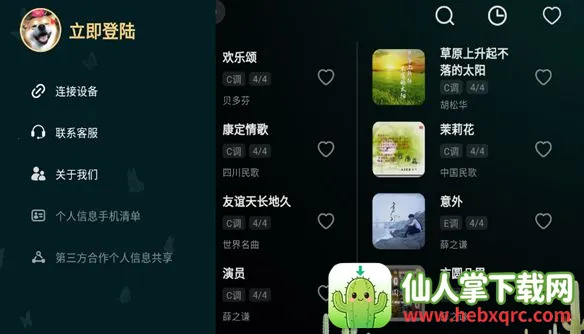 彩虹弹唱app使用起来超简单!它能让零基础的你轻松上手弹奏键盘吉他。只要喜欢唱歌,跟着节奏旋律,就能尽情弹唱,舞台由你主宰。这里有海量智能曲库,实时更新上万首智能曲谱,网络流行歌、KTV必点经典老歌、儿童精选、国外经典歌曲啥都有。而且能随心切换多种乐器,比如钢琴或吉他,找到自己的主场演绎旋律。还有智能个性化设置,支持蓝牙连接智能设备,5种弹奏模式、12种调性、自定义速率、智能伴奏、亮灯提示等贴心功能等你发现。不管是音乐学习、创作,还是娱乐休闲,它都能满足你。用它前先同意用户服务协议和隐私政策,里面歌曲超多,热门的、能搜的应有尽有。登录也不难,首页点左上角图标打开菜单,点立即登陆按提示操作就行。快来下载彩虹弹唱app,享受音乐乐趣吧!