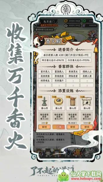 想体验独特的道门经营养成吗?《了不起的道门》就能满足你!在这里,你将扮演落魄道观观主,从零开始复兴宗门。通过求道台用摸骨术招募弟子,根据资质优劣合理培养,轻松提升宗门实力。作为掌门,可建设建筑吸引信徒,在坊市买卖法器积累财富资源,扩建宗门。游戏还有多样特色玩法,香火殿求签问卦感受国风文化,炼制道器提升战力,带领弟子下山除魔抓鬼解锁成就。其最大亮点是轻松护肝,离线也能自动积累资源提升弟子实力。画面采用细腻国风水墨画风,搭配悠扬音效,营造脱俗修真感。还能与其他玩家交流切磋,分享心得经验。快来《了不起的道门》,开启你的道门经营养成之旅,打造属于你的鼎盛修炼圣地!