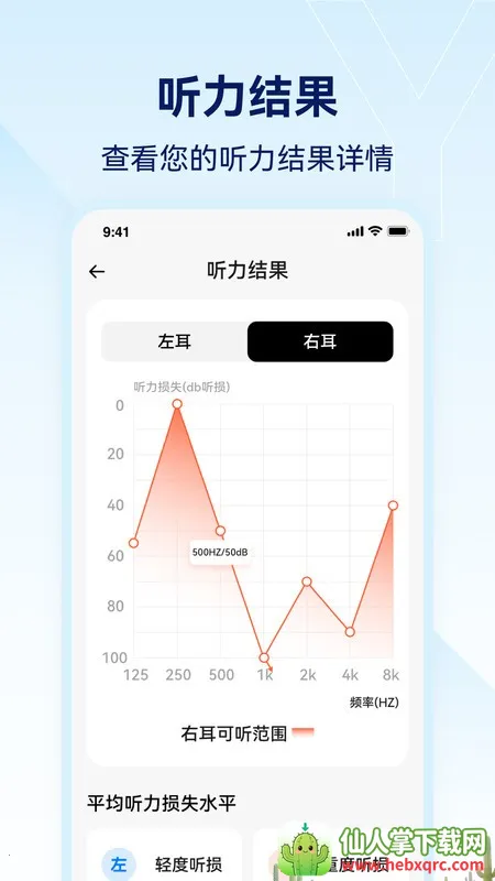 2. 精准测听:通过纯音测试,给左右耳播放不同频段,帮助听损患者检测听力受损程度,并提供专业定制方案,及时了解自身听力情况。