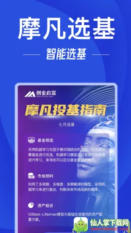 创金启富APP是一款超棒的金融投资平台。它能通过AI学习算法处理海量金融数据,为咱提供全流程服务。有线上基金交易,还有基金诊断、对比等实用工具。咱可以用行情数据多维度对比分析不同基金,辅助筛选优质产品。摩凡选基功能利用AI算法快速定位适合自己的基金。支持基金购买、赎回、定投计划设置,费率还更优惠。能根据咱的风险偏好提供定制化资产配置方案,VIP用户还有专属顾问服务。724小时更新市场数据,推送简报、观点和分析报告,帮咱把握投资时机。展示基金经理历史业绩、投资风格等辅助决策。界面清爽,主要功能三步内可达,交易流程简化,降低咱的学习成本。有了它,咱在金融投资方面能更轻松、科学地做出决策,满足咱了解金融投资信息及进行操作的需求。