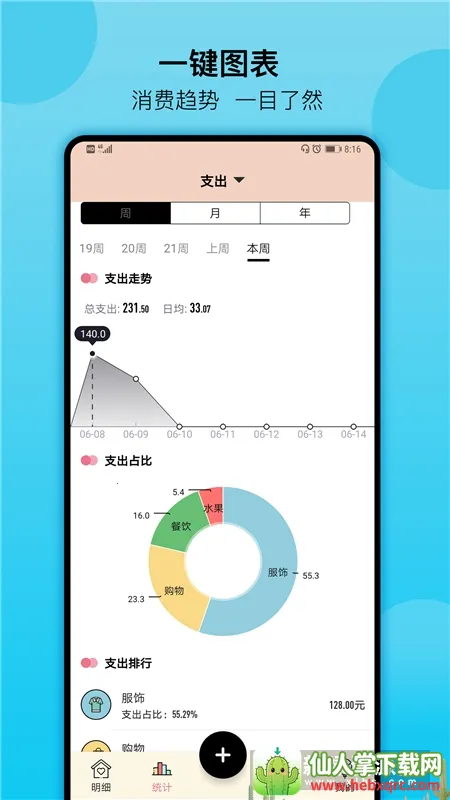 2. 智能统计:线图饼图清晰展现每周每月收支构成,消费趋势一目了然。