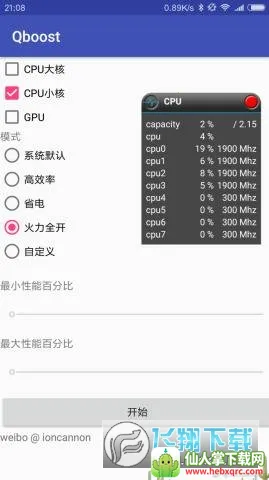 QBoost火力全开模式能让你的手机性能大幅提升!它是一款超棒的手机性能处理软件,有很多实用功能。能全面展示手机信息,像内存使用、系统版本等,让你随时掌握运行状态。还能监测设备健康,优化内存管理,查询系统版本。特色是可切换不同降频模式,比如省电、性能模式。支持实时监测CPU数据,了解其运行情况。设置菜单直观简单,无需root权限,保障手机安全。优势明显,能让手机运行更流畅,电池续航更持久,优化手机的同时还能提高游戏画质。玩游戏时开启火力全开模式,能让游戏超级流畅。使用时先下载安装APP,设置参数,选择想要的模式或自定义调节,最后启动设置就行。注意勾选gpu,选高效率模式,若还卡可勾选大核小核,不过要注意,oppo和vivo部分安卓6.0以下版本不能安装,也别经常全力开火,以免耗电池和损坏cpu。