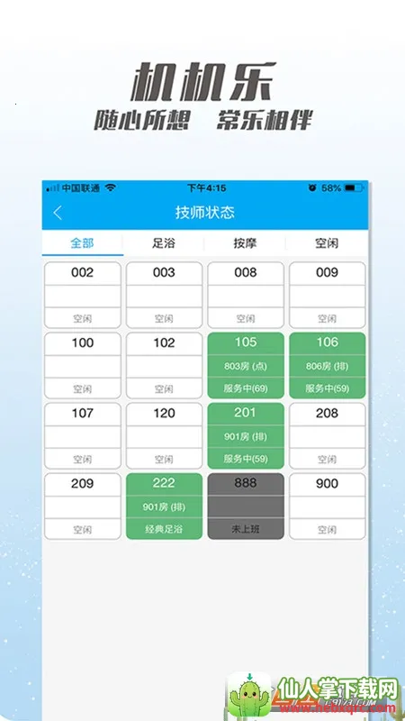 3. 技师状态轻松掌握:每个技师的工作状态都能轻松查看,服务中空闲状态一目了然,便于合理安排工作。