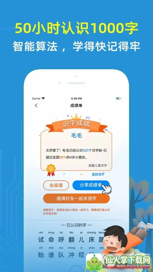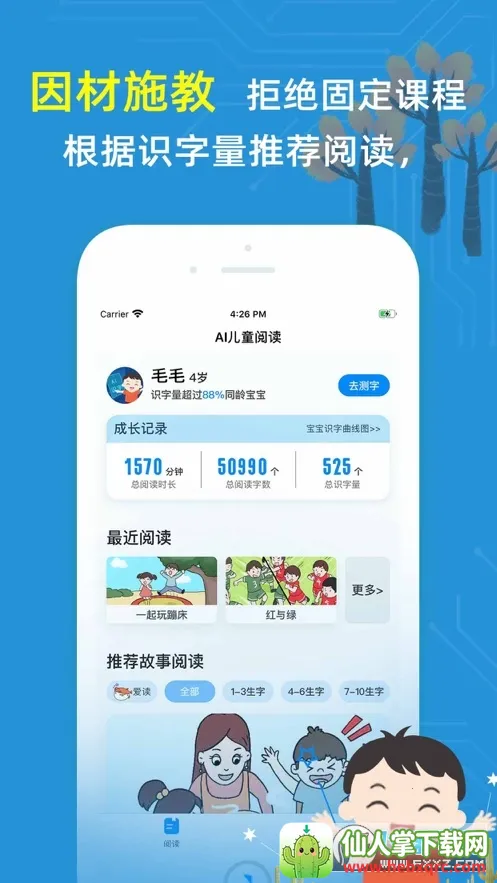 1. 个性化教学:通过专业测试数据分析孩子特点与学习进程,依识字量推送原创内容,让孩子轻松识字。