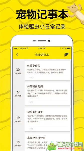 4. 记录与陪伴:支持记录爱宠日常点滴,无论是体检驱虫还是生活趣事,都能留存,让主人更好地陪伴爱宠成长,留下美好回忆。