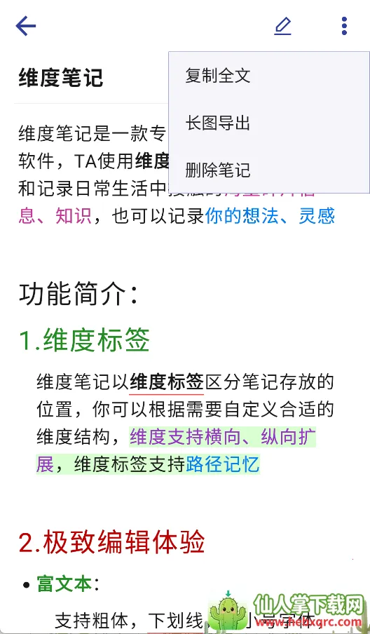 维度笔记2026官方最新版本是一款以多维信息管理为核心的智能笔记工具。支持多格式记录,有多层级标签嵌套、AI算法等特色,具备云端加密存储、三端实时同步等功能,适用于全场景,助力构建个人认知图谱。