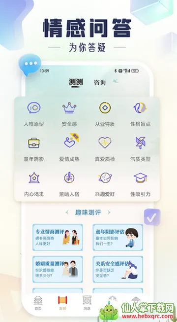 3. 功能丰富多样:提供情感咨询、婚姻调解、心理疏导等多种功能,还有海量测试、趣味报告、安心倾诉等特色内容,能满足不同需求。