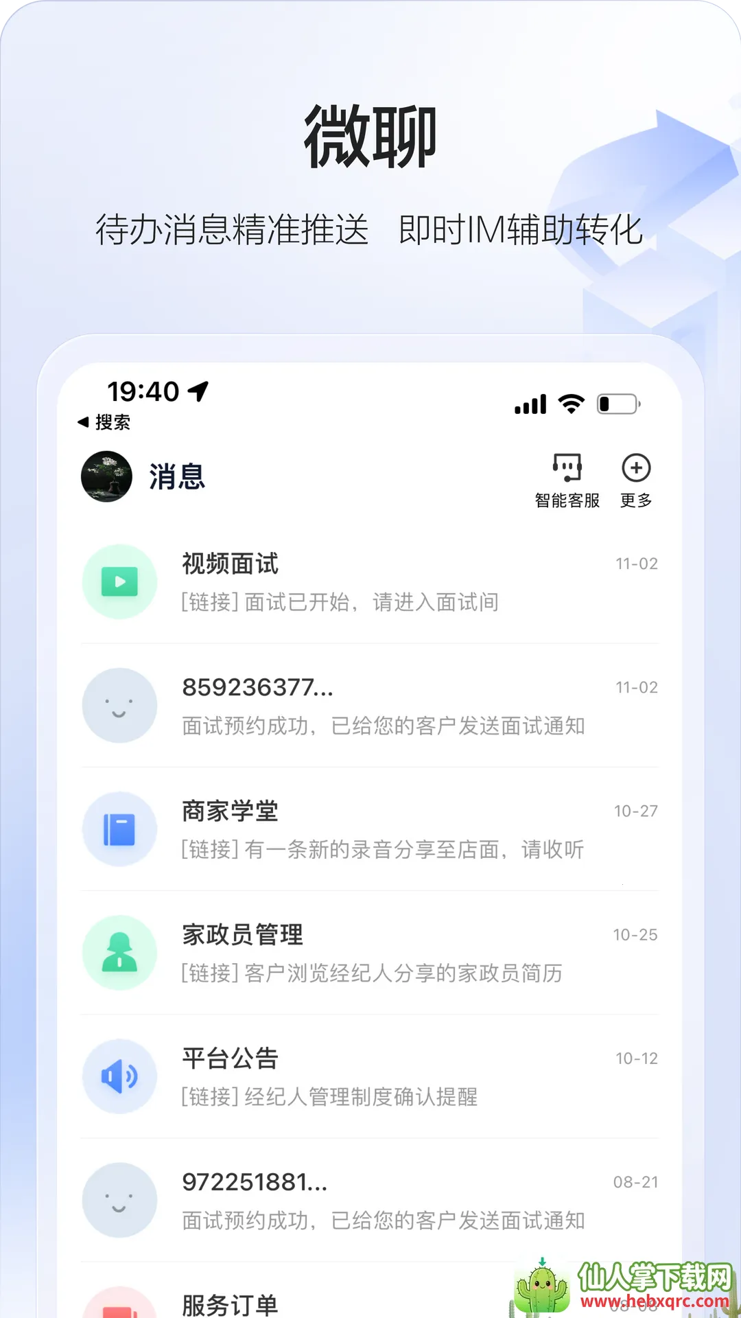 4. 功能全面,涵盖客户管理、共享阿姨库、微聊消息、培训管理等,为家政业务提供一站式解决方案,助力提升效率与质量。