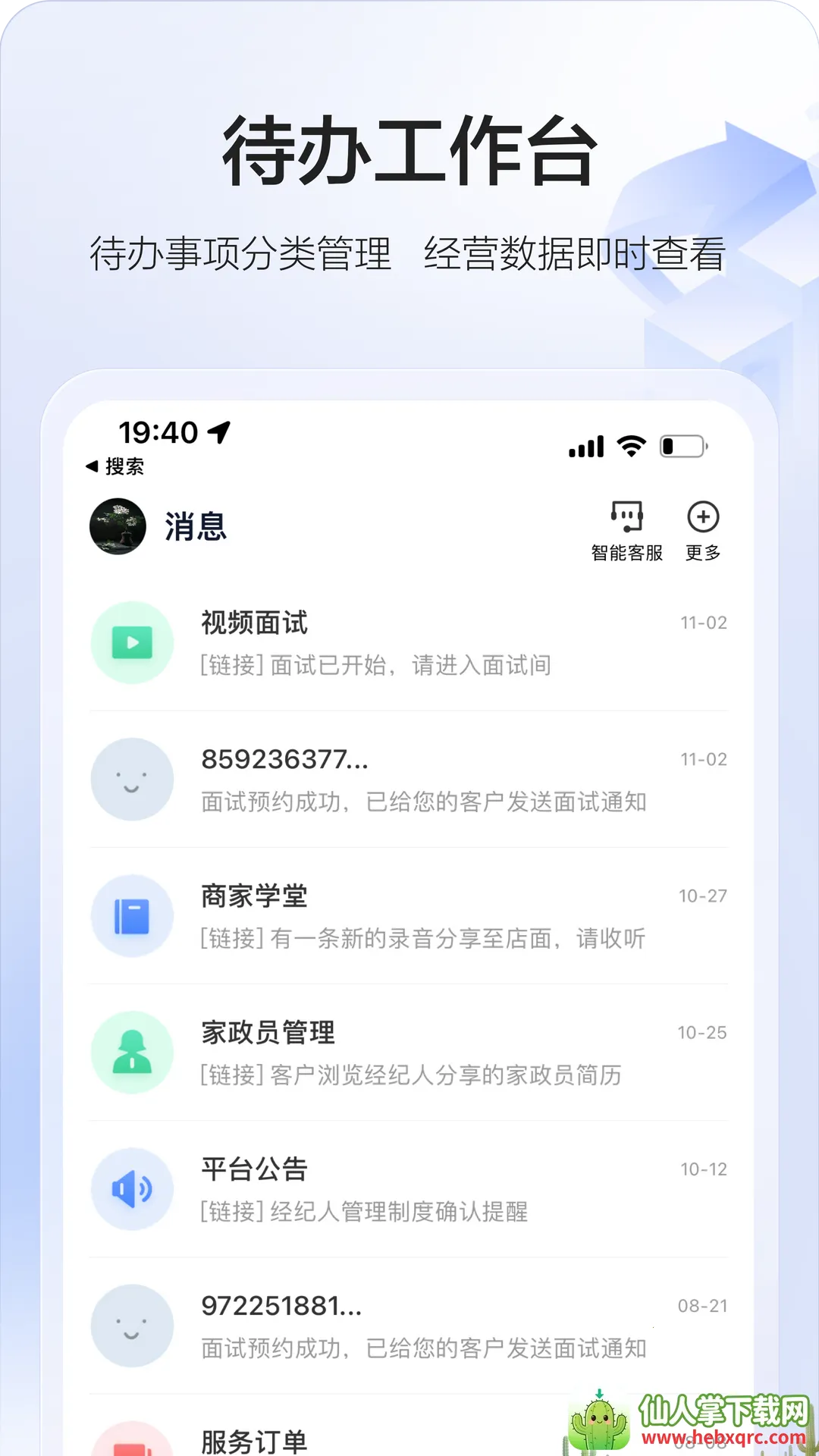 它有客户管理平台,能精准分配客户,保证线索价值最大化。共享阿姨库很棒,阿姨都经过百分百体检背调,找好阿姨不再困难。首页工作台聚合了多种高频作业板块,像线索接单、待办事项管理等,能为每日工作精准提效。微聊消息接收平台可推送线索、阿姨动态等,方便即时沟通。培训管理能辅助商家开展阿姨培训业务,提升阿姨专业度和就业率。