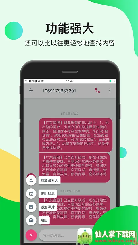 2. 功能强大:支持彩信分享照片贴纸、群聊,具备群发、延迟消息发送、搜索等功能。