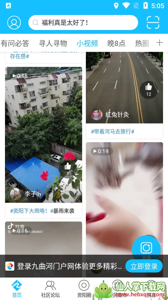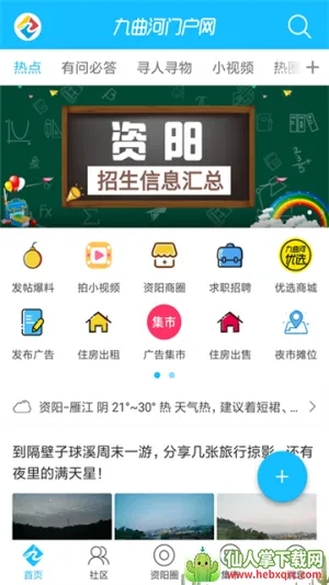 资阳九曲河门户网是一款超实用的生活服务软件。它能帮你快速查找各类生活信息,比如周边商家,像餐厅、超市、理发店等,方便日常所需。房屋租赁、招聘求职信息也能轻松查到,给生活和工作带来便利。热点资讯及时推送,本地新闻动态、政策变化等都能第一时间知晓,身边大事小情全掌握。还有文化活动、旅游景点信息分享,丰富业余生活。特色功能超多,首页活动专题有趣,发布按钮便捷。论坛热点不断,发帖体验好,还有草稿箱。资阳圈可社交分享,小视频图片随意拍。同城交友上线,打招呼方便。能和好友实时语音视频聊天。个人中心界面优化。积分等级玩法新颖,支持贝壳打赏。快捷登录超方便,页面加载简洁,还有护眼模式。有了它,生活更轻松,赶紧来下载吧!