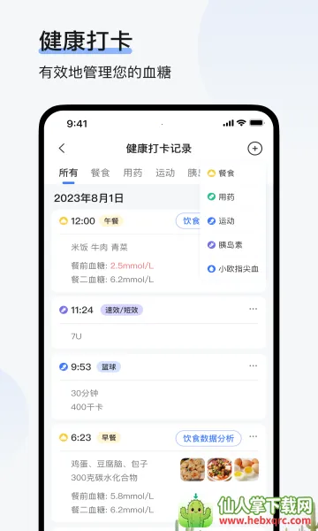 健康打卡:记录餐食、运动、体重、胰岛素、用药与指尖血等信息,与血糖曲线联动,复盘更清晰,助建控糖习惯。