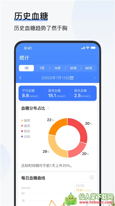 1. 实时精准监测:连接血糖监测设备后,能在手机端实时展示血糖数值与变化趋势,多时间维度曲线呈现,助您直观了解身体对饮食、运动、用药的反应。