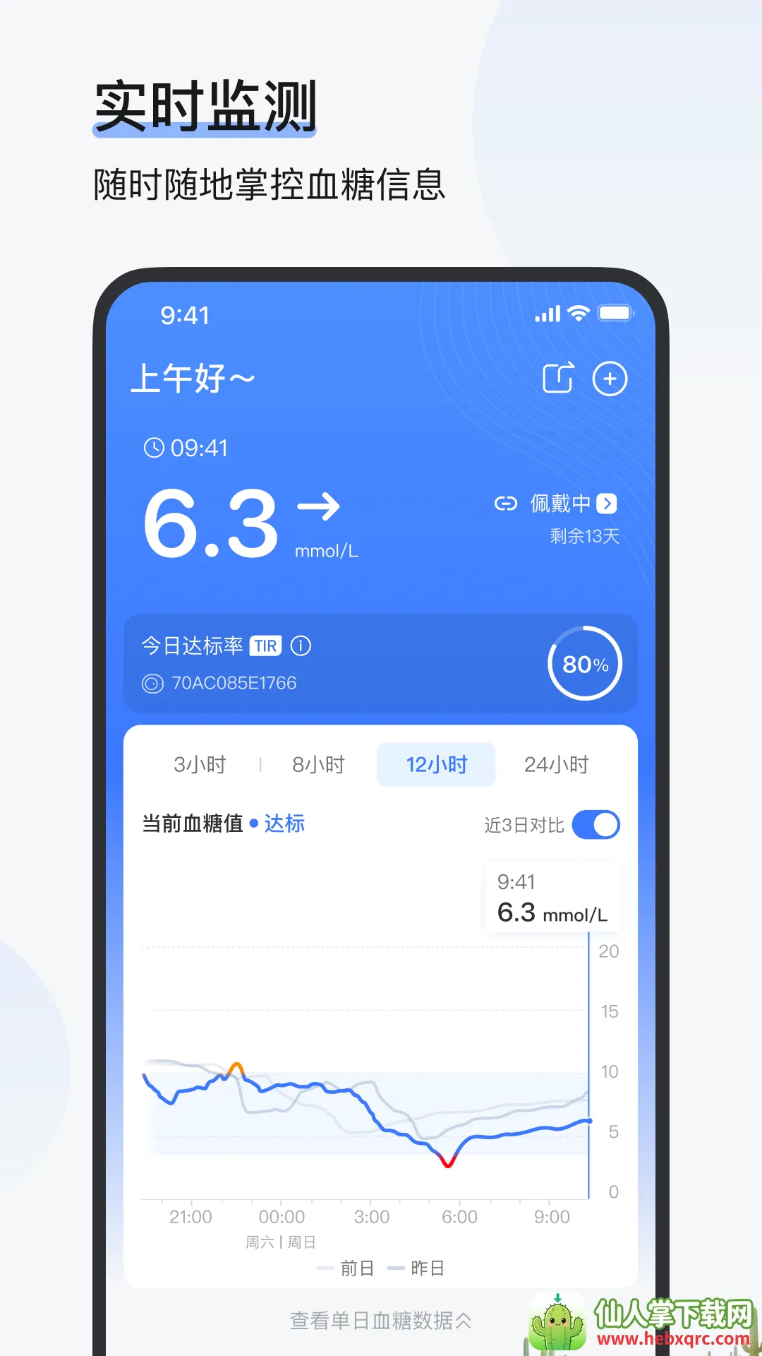 实时监测:连接设备后,手机端展示实时血糖数值与变化趋势,多时间维度曲线呈现,波动清晰可见。