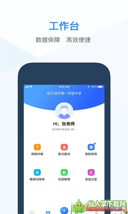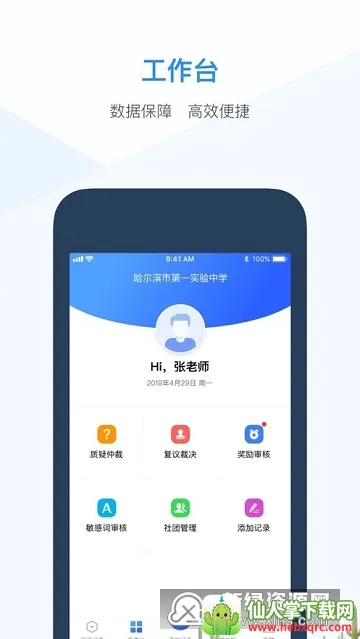 功能全面:工作台功能全面,选择各项工作办理更轻松,省时省心;能查看综评记录数据、学生信息、成绩记录、公告数据等,还可针对学生记录质疑和复议进行裁决,进行敏感词审核、重要奖励审核、社团管理等操作。