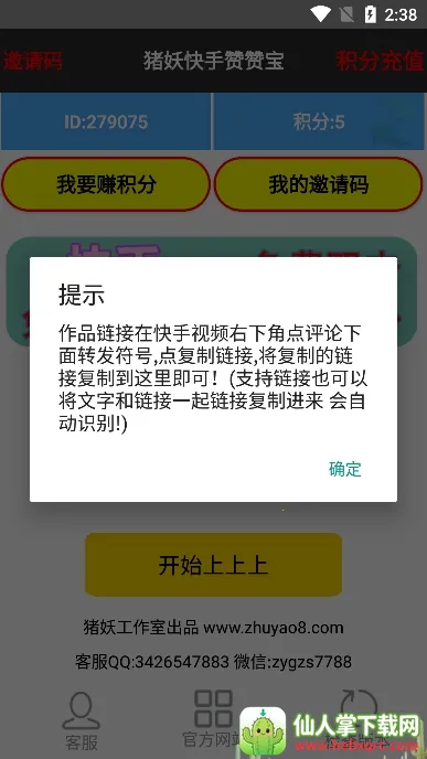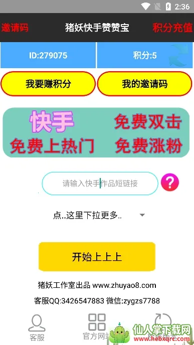 它功能多样,比如能刷名片赞、给空间刷人气;可为K歌加花和评论;还能帮你结交志同道合的粉丝营,提升播放量与人气。使用它,运行速度快,不卡顿不掉线,稳定性超高。支持多账号同时登录,能提高点赞效率。获得积分的方式也不少,输入邀请码可立即得100积分(每人限一次),邀请人能获200积分还增加5次免积分机会,完成相关任务也能获取积分。有了快手赞赞宝,就能轻松玩转快手,让你的账号人气飙升!
