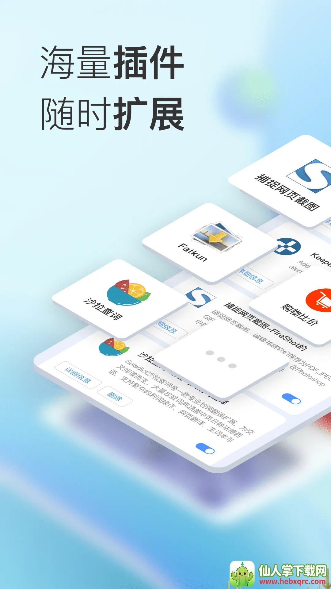 1. 海量扩展:可按喜好添加或移除插件,如全球速递、购物比价等,重新定义专属个性化浏览器。
