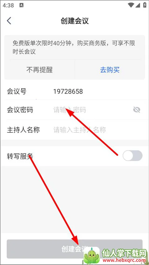 2、创建会议页面,输入会议密码、主持人名称等,点击创建;