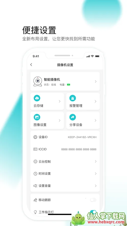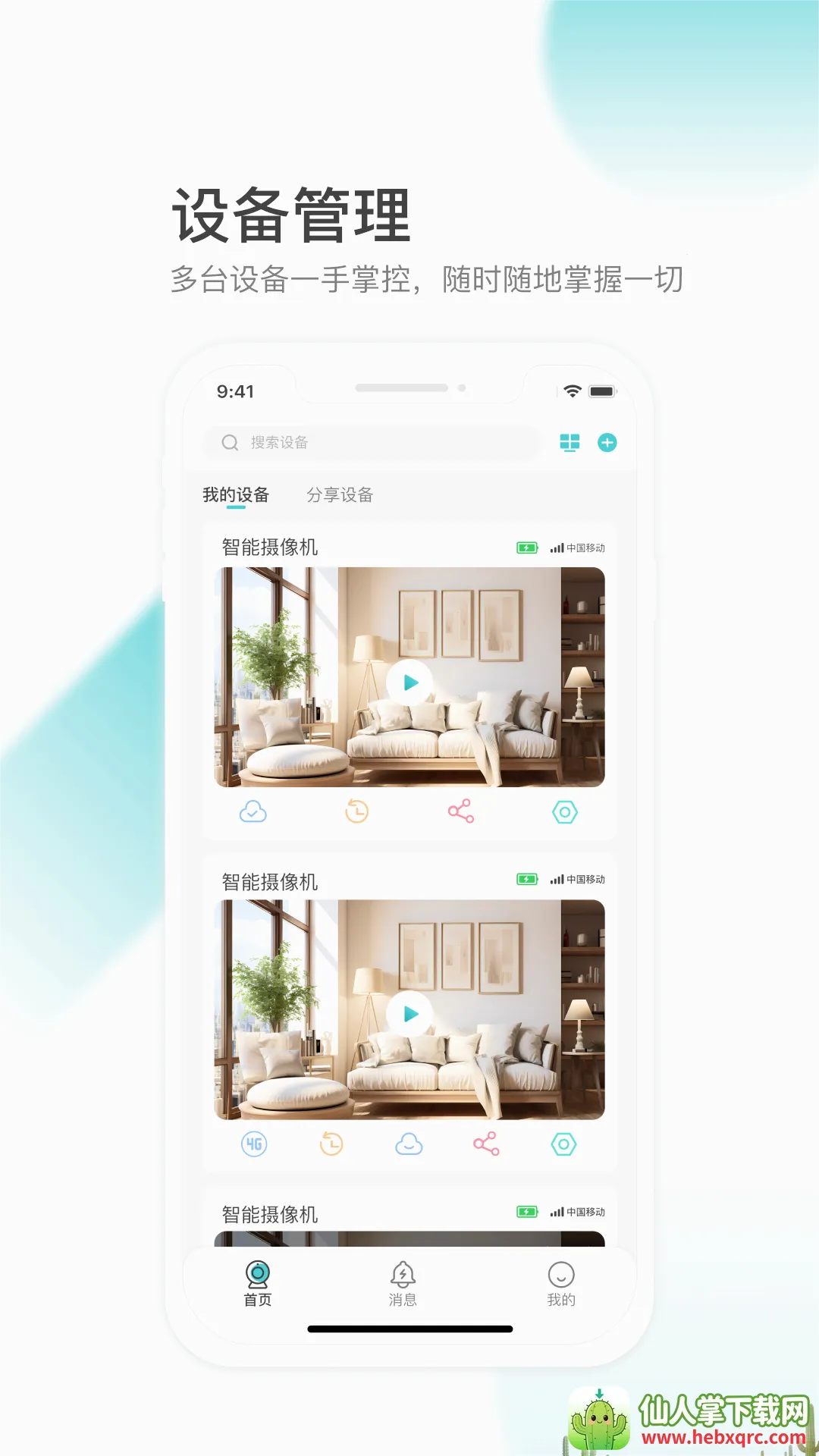 2. 便捷管理设备:支持移动侦测报警推送等功能,还可同时管理多台设备,随时随地掌握设备状态,通过分享设备功能,能与家人朋友共同管理监控设备。