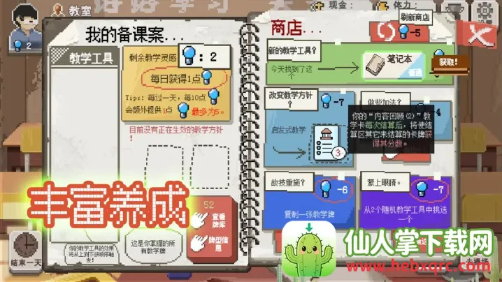 3. 丰富多样的游戏内容:拥有季节和天气系统,四季变化影响教学安排;多结果设计,根据教学成果、学生命运和学校发展触发不同结局;核心教学环节采用卡片组合法传授知识;发展课外生活,通过种菜、钓鱼、爬山等活动获取资源,卖菜做饭补充能量和资金,模拟真实农村生活。