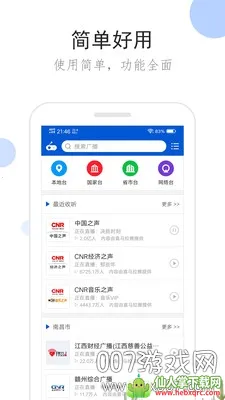 它优势明显,播放稳定流畅不卡顿,智能推荐符合兴趣。特色是自动定位本地广播,展示国家及各地省级广播。支持网络广播、定时关闭、广播回听和录制。总之,想听广播就选它,各类节目应有尽有,给你超棒的收听体验!