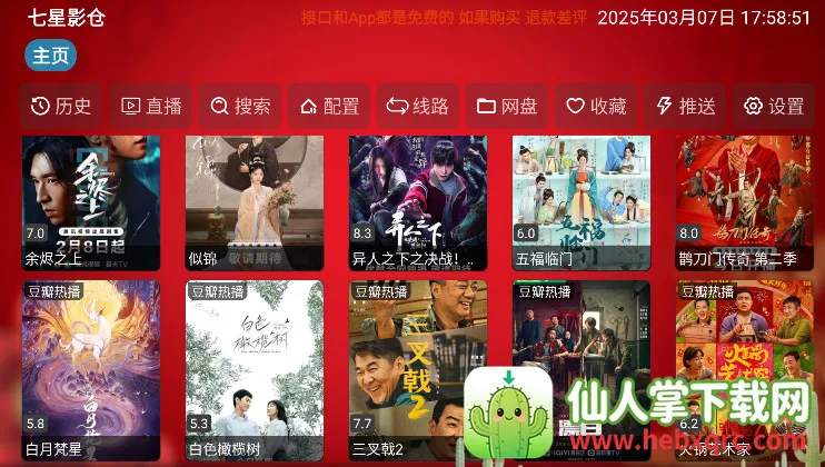 七星影仓是款超棒的影视软件。它有海量影视资源,电影、电视剧、综艺、动漫等应有尽有,国内外热门作品都覆盖。播放超流畅,多种清晰度可选,适配多种视频格式。智能推荐系统超贴心,依据观看历史和偏好推送相似内容,轻松找到爱看的。还支持多屏互动与离线缓存,手机能投屏,没网络也能看。软件无广告干扰,更新快,跨平台兼容,不管是智能电视、手机还是平板都能用。其TV版专为大屏设备设计,界面简洁操作便捷。手机版功能也丰富,能实时看评分口碑,支持边看边缓存、自定义缓存地址,还有语音搜索、弹幕功能、多语言支持等。七星影仓2025最新接口配置能让你获取更稳定、丰富的资源,享受更优质的观影体验,轻松满足你的影视需求。