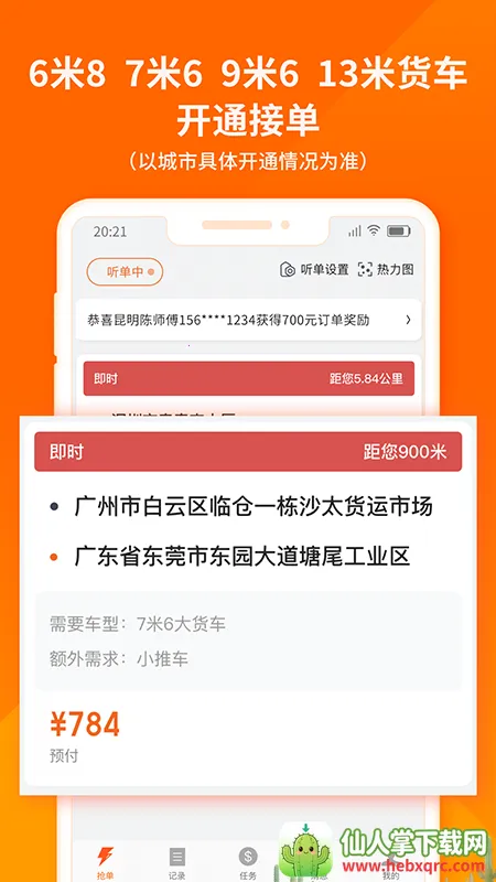 1. 车型丰富:能匹配小面、中面、金杯、依维柯、单双排货车、开顶货车、平板货车、厢式货车、加固货车、帆布货车,6米8、7米6、9米6大货车等车型,海量订单任您选。