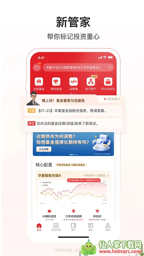 华夏基金管家是一款超实用的基金管理软件。它整合了活期通现金管理、资产查询、基金净值查询和交易等多种功能。能随时随地进行认购、申购、赎回、定投、信用卡还款、交易查询、个人账户管理等多项操作。针对理财小白推出定投类产品,一键定投帮您省却选基金择时和操作繁琐的烦恼。还有智能推荐、一键定投、个性化理财、享受活期通折扣等特色。不仅可直接购买华夏基金公募和投顾组合产品,还能查询其他代销渠道买入的产品。软件亮点众多,比如基金交易便捷,账户查询实时,活期通随手存随时取随心用,能轻松切换到华夏活期通客户端使用,还可便捷查询产品净值、行情等信息。有需要的小伙伴欢迎来本站免费下载使用。