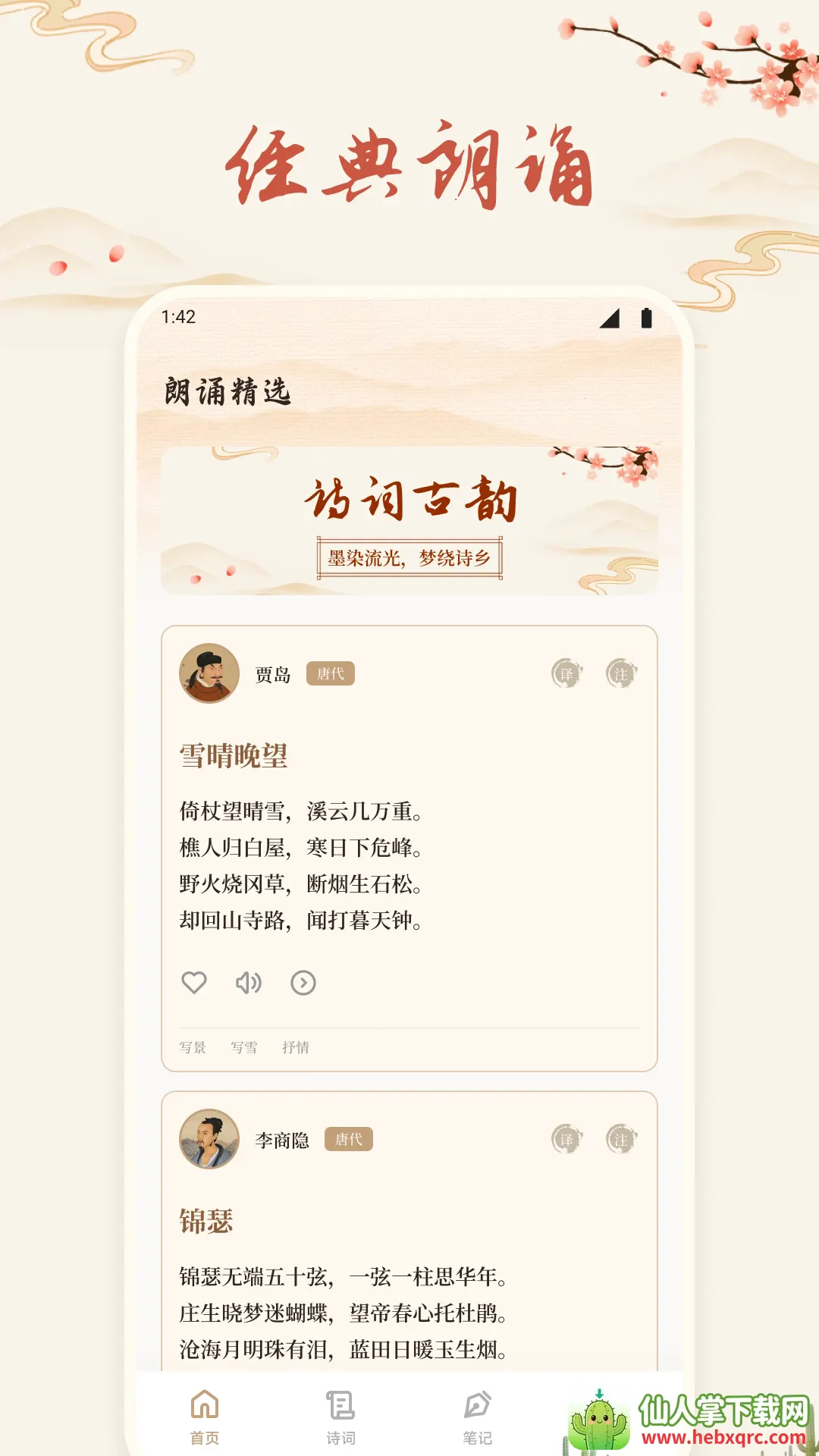 诗歌本有声 2026 最新版本是贵阳铁粉秀科技有限公司推出的诗词阅读软件。收录数千首经典诗作,有专业诵读解析、动态插画。具备分类查找、创作、离线下载等功能,还有阅读轨迹、社交互动等亮点,助力用户轻松学诗词。