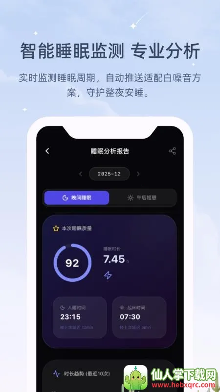 2. 可追踪睡眠数据,每晚智能管理睡眠时间和时长,还能查看清晰的睡眠报告,随时了解自身睡眠状态。