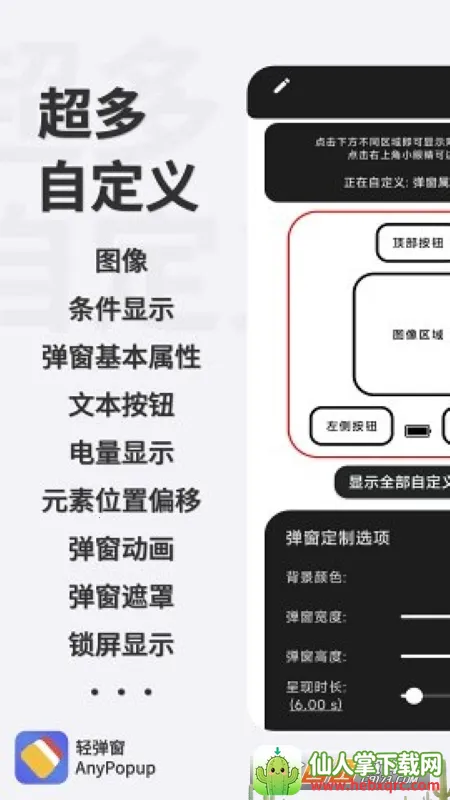 除了上方的弹窗文字内容及图片,Bear Pop-up还提供了丰富的可自定义选项,包括弹窗背景色、文字颜色(上左右文字颜色、*电量显示文字颜色)、弹窗尺寸(显示长宽)、弹窗呈现时长、左右侧按钮应用跳转、*圆角大小、*弹窗样式(方向)、*动画循环次数及*电量显示开关 。带'*'属性为登录授权用户可定制属性。