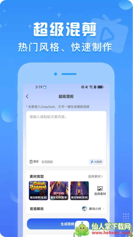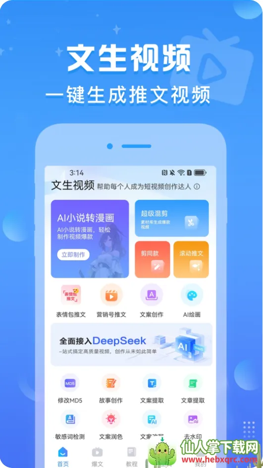 文生视频是手机视频创作软件,剪辑融入deepseek大模型,有丰富模板。导入视频可自动剪辑,支持文字转视频,无水印,有教学,支持音频导入。使用需授权限,联网调用模型,可存创作记录,会员无次数限。