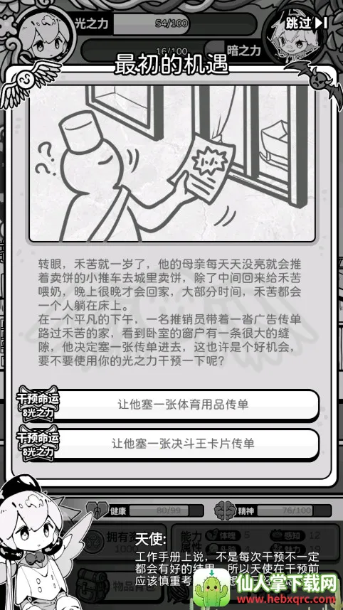 天使模拟器是一款文字题材模拟游戏,黑白漫画风。玩家扮演天使,为倒霉短命鬼提供庇护,通过卡牌组合与资源分配干预其人生轨迹,面临多种选择和意外,还有多种职业与随机事件,玩起来趣味十足。