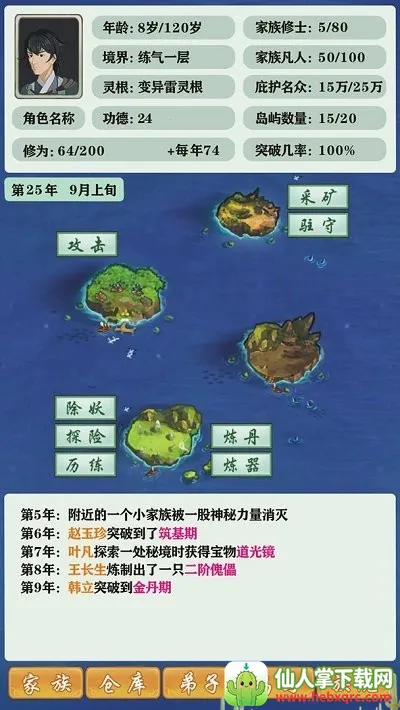 地图随机生成:每次重来世界地图重新生成,家族岛屿周边情况各异,可能有妖兽老巢、魔道宗门、灵岛等,体验充满变数。