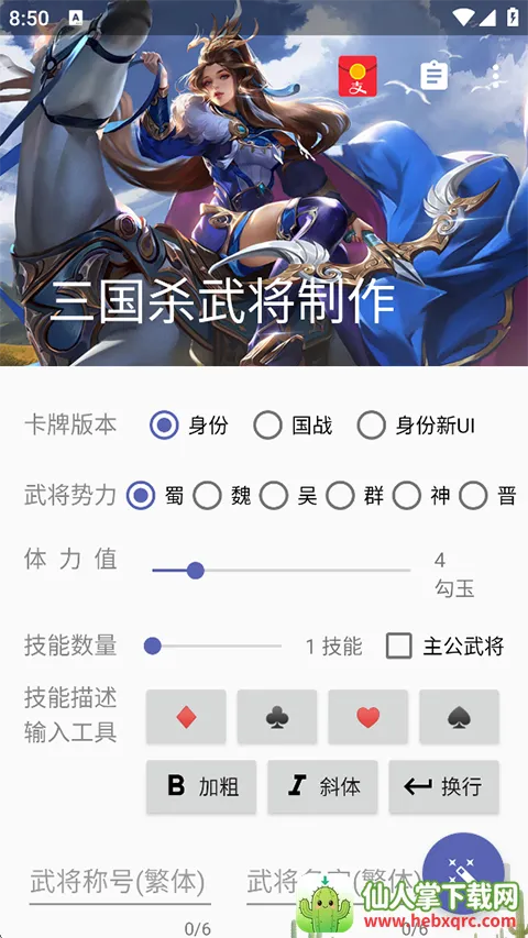想自己设计独一无二的三国杀武将?这款移动版新UI制作器正是你的神器。它专为手机打造,界面清爽直观,让你随时随地开启DIY之旅。你可以从海量三国武将中挑选素材,自由定制势力、体力值及卡牌数量,甚至能输入专属称号、名字和技能描述,支持繁体字显示,完美还原你心中的英雄形象。