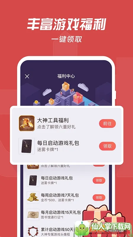 3、海量福利每日领取。绑定游戏帐号,解锁游戏特权 buff 加成,每日签到领福利,道具惊喜掉落,活动礼包不停。