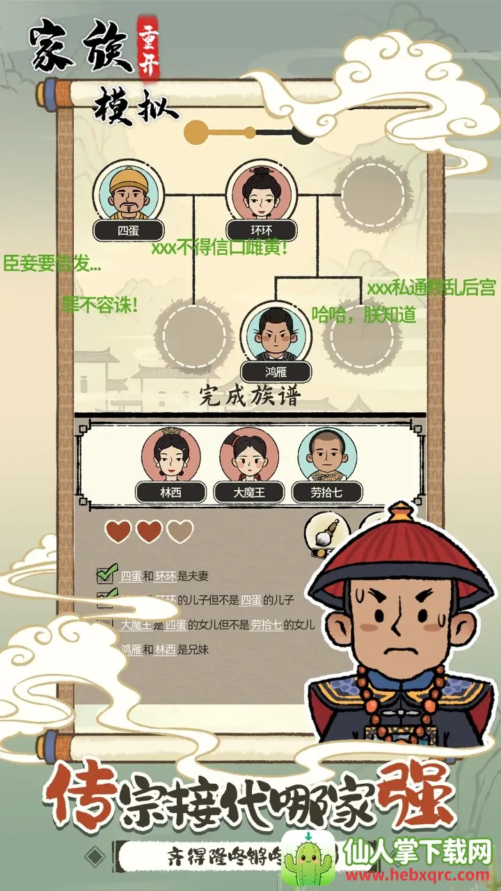 2. 趣味族谱重建:依据族人有趣事迹找线索,合理放置在族谱位置,从远古到近代重建族谱,充满探索乐趣。