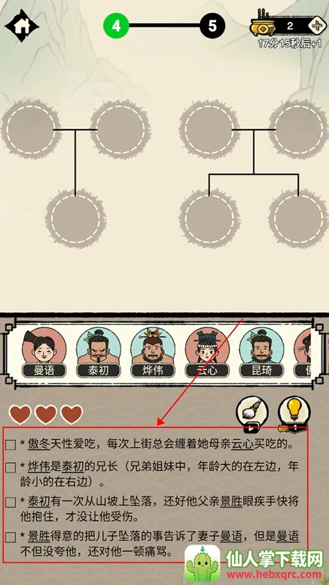 2. 根据族人有趣事迹寻找关系线索,合理放置族人在族谱位置,考验敏捷才思。