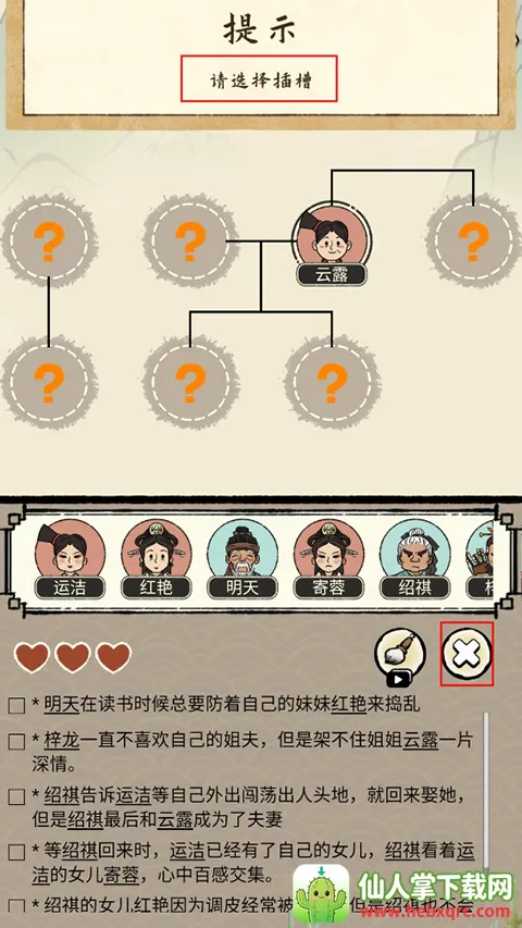 2、进入关卡后,玩家需要根据下方文字提示,将人物头像拖入上方合适圆框内,进行族谱的修缮。