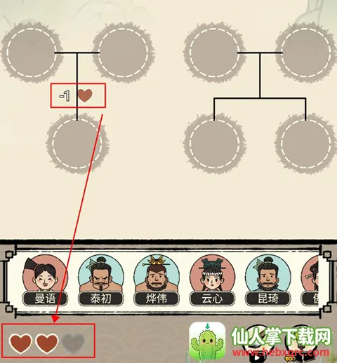 3、如果拖入的人物与圆框不不对应,会扣除血量,三格血量全部扣除即为失败,因此玩家需要小心判断。